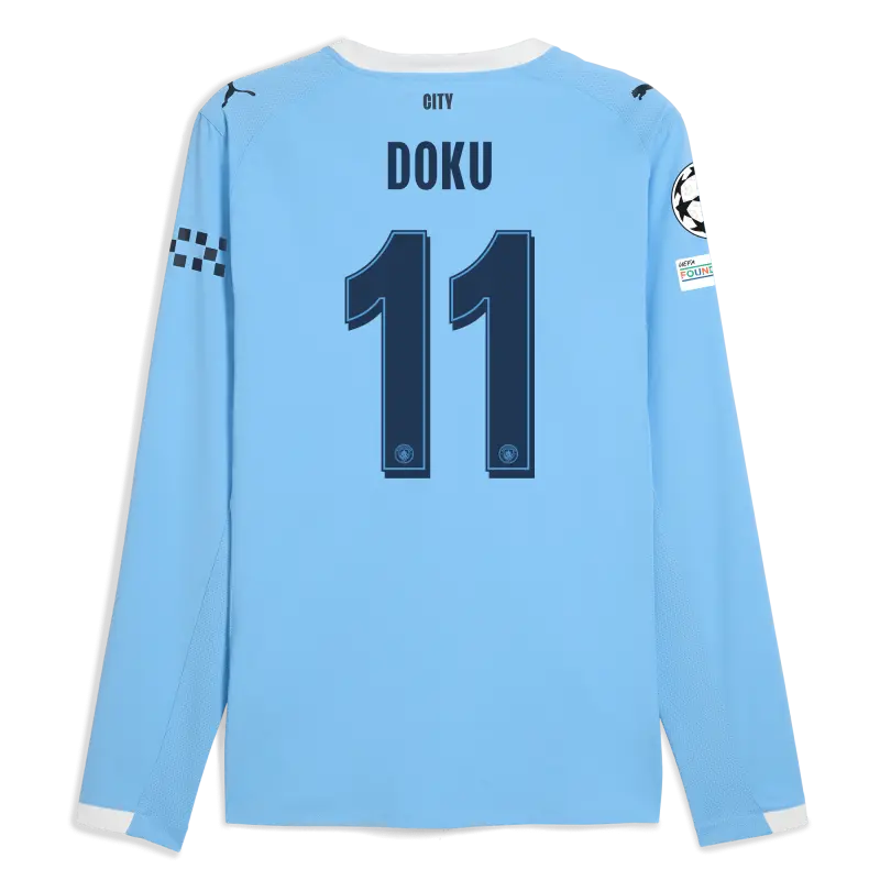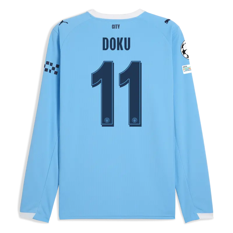 Manchester City Man City Champions League Home Authentic Jersey 2025/26 Long Sleeve With DOKU 11 Printing