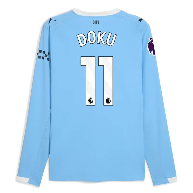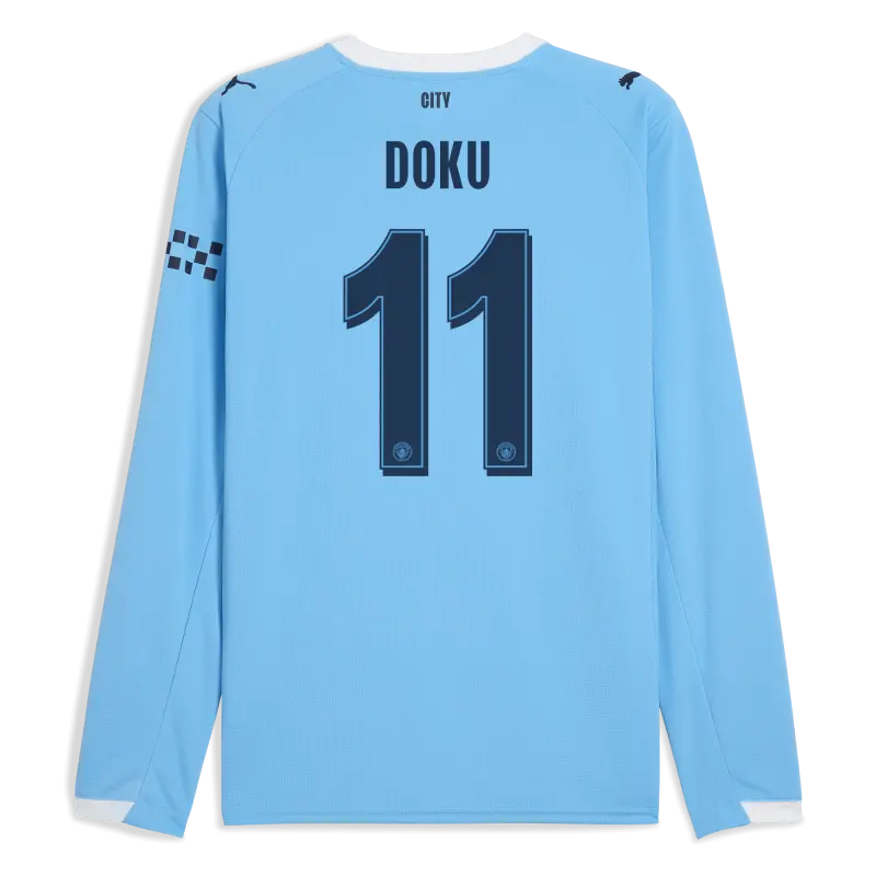 Manchester City Premier League Home Jersey 2025/26 Long Sleeve With DOKU 11 Printing