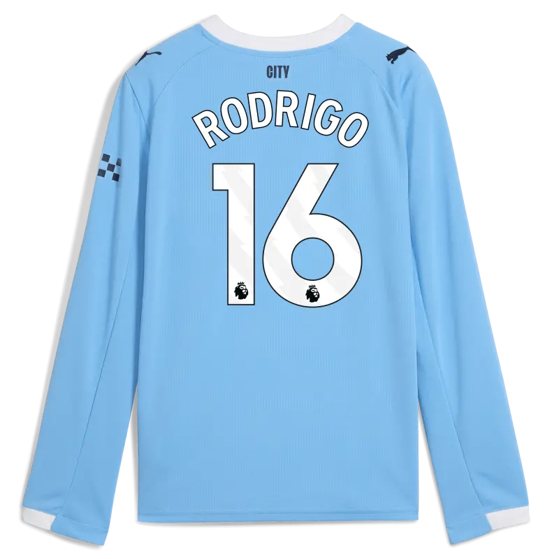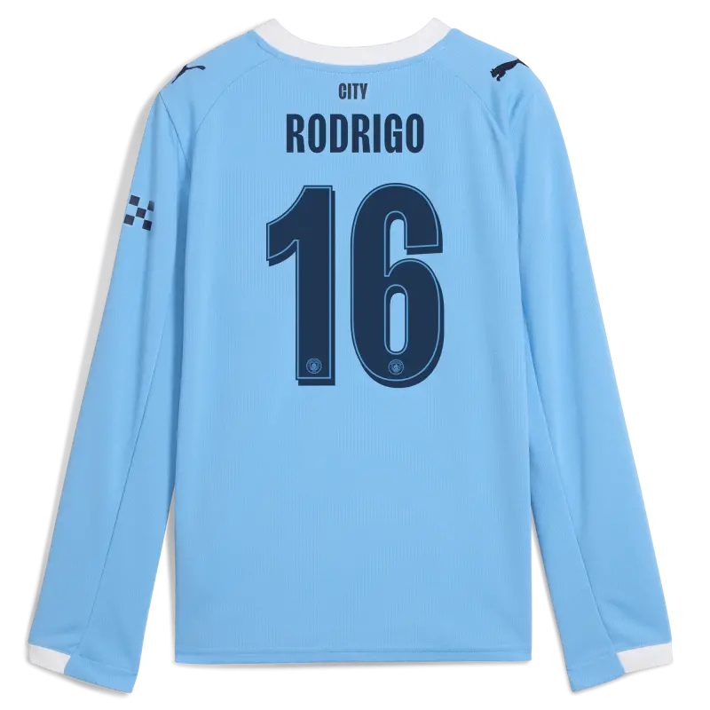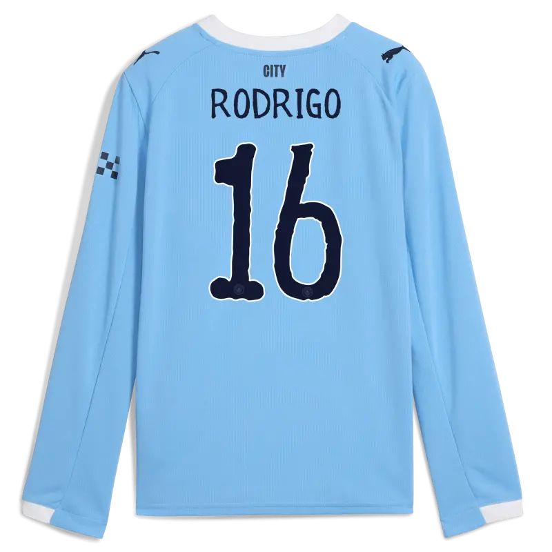 Kids’ Manchester City Man City Home Jersey 2025/26 Long Sleeve With RODRIGO 16 Printing