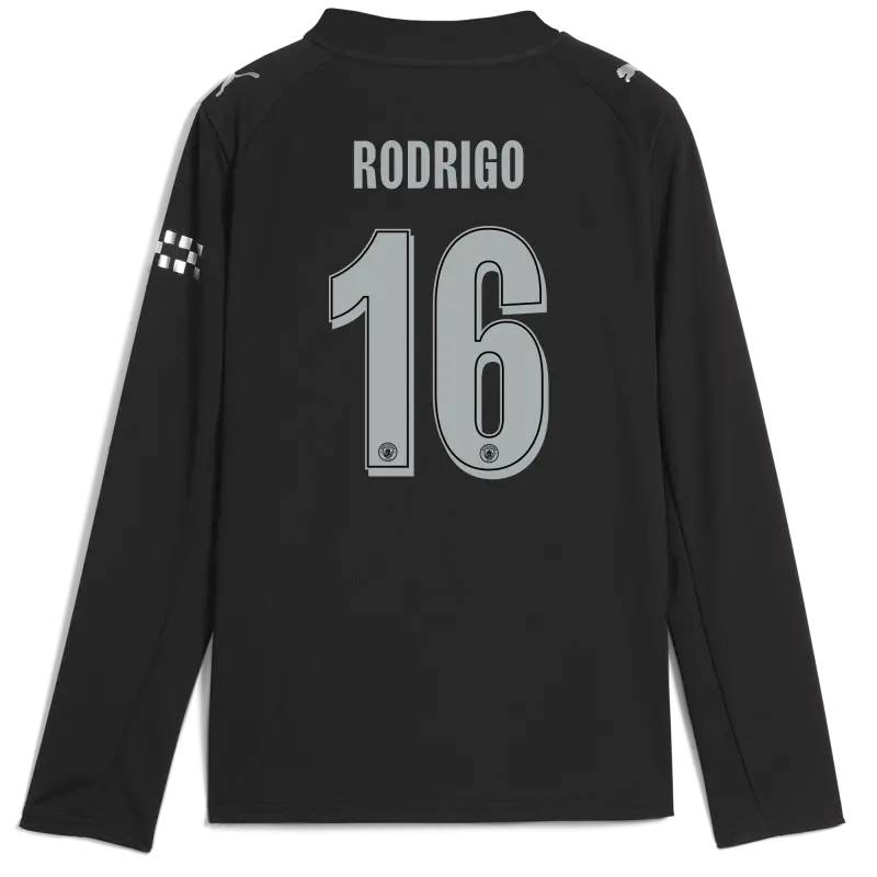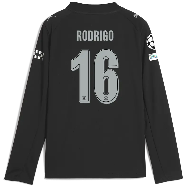 Kids’ Manchester City Man City Champions League Away Jersey 2025/26 Long Sleeve With RODRIGO 16 Printing