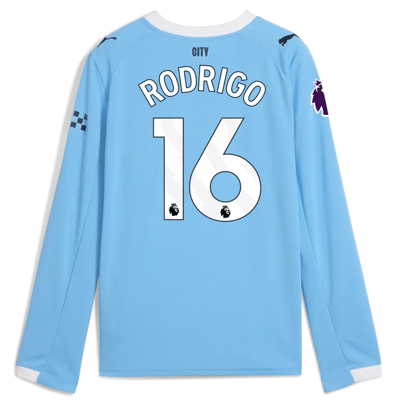 Kids’ Manchester City Premier League Home Jersey 2025/26 Long Sleeve With RODRIGO 16 Printing