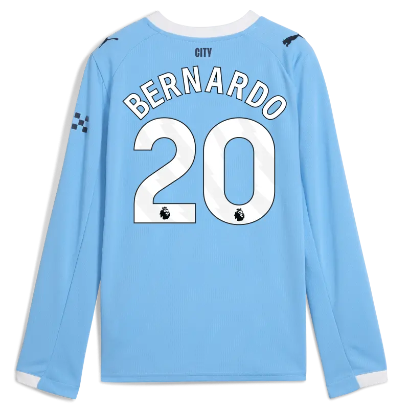 Kids’ Manchester City Man City Home Jersey 2025/26 Long Sleeve With BERNARDO 20 Printing