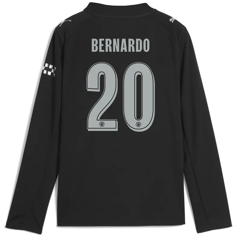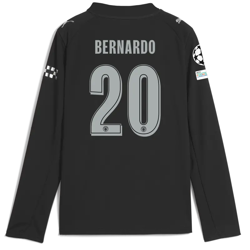 Kids’ Manchester City Man City Champions League Away Jersey 2025/26 Long Sleeve With BERNARDO 20 Printing