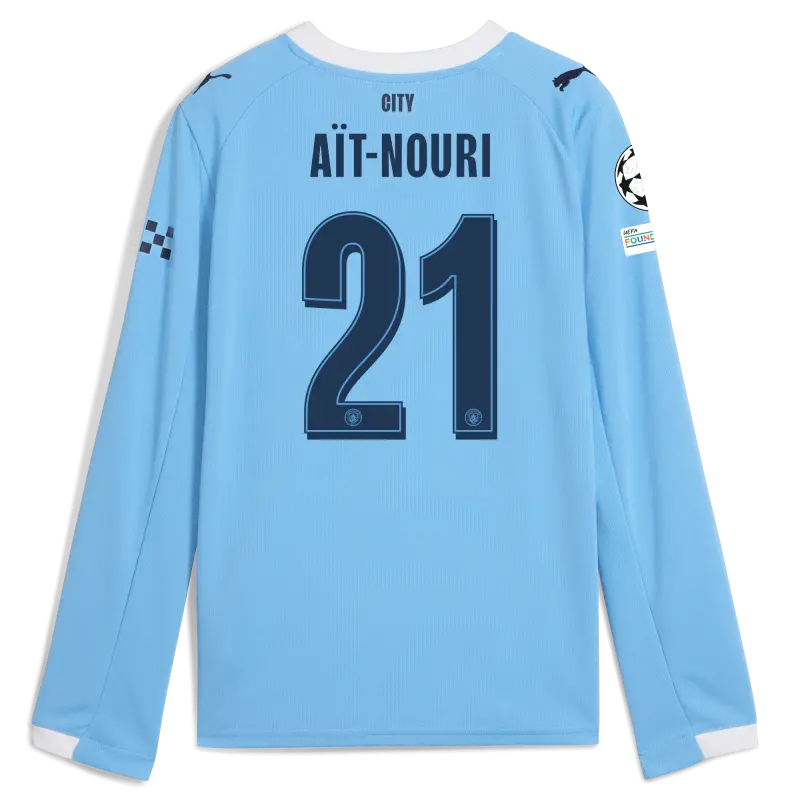 Kids’ Manchester City Man City Champions League Home Jersey 2025/26 Long Sleeve With AÏT-NOURI 21 Printing