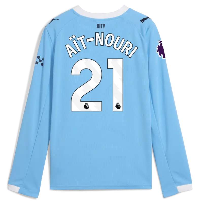 Kids’ Manchester City Premier League Home Jersey 2025/26 Long Sleeve With AÏT-NOURI 21 Printing