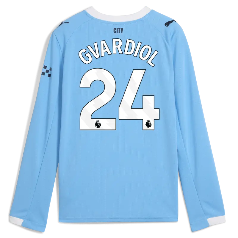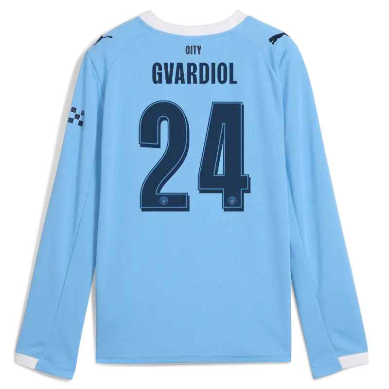 Kids’ Manchester City Home Jersey 2025/26 Long Sleeve With GVARDIOL 24 Printing