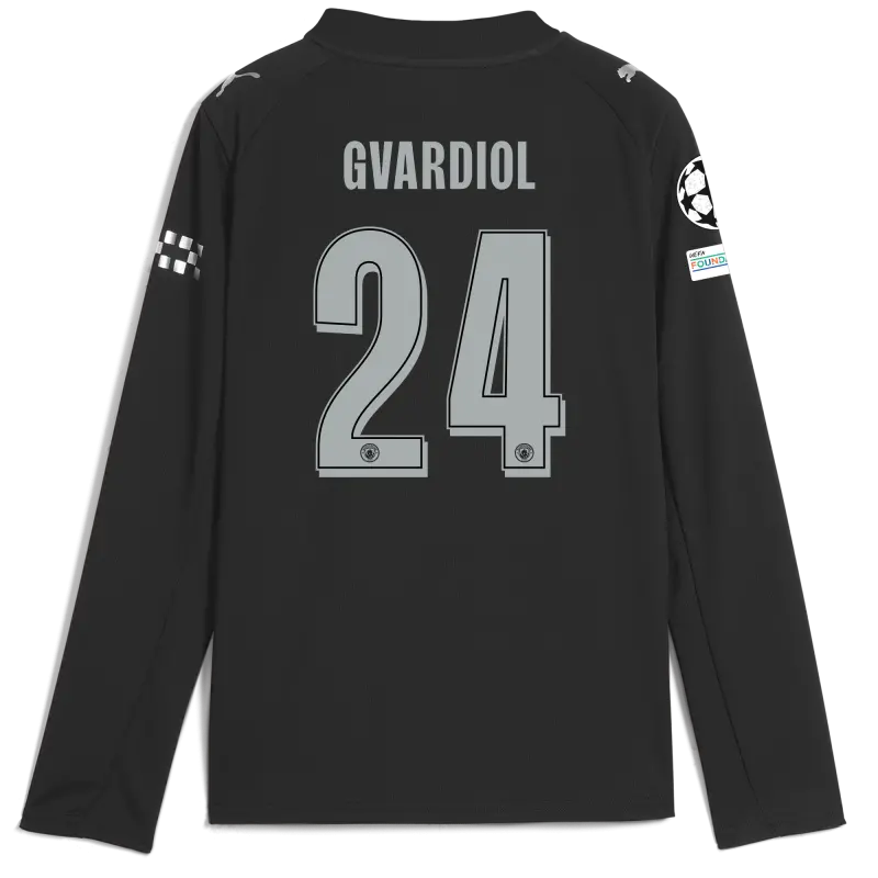 Kids’ Manchester City Man City Champions League Away Jersey 2025/26 Long Sleeve With GVARDIOL 24 Printing