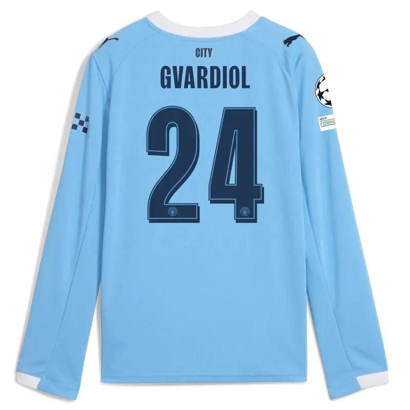 Kids’ Manchester City Man City Champions League Home Jersey 2025/26 Long Sleeve With GVARDIOL 24 Printing