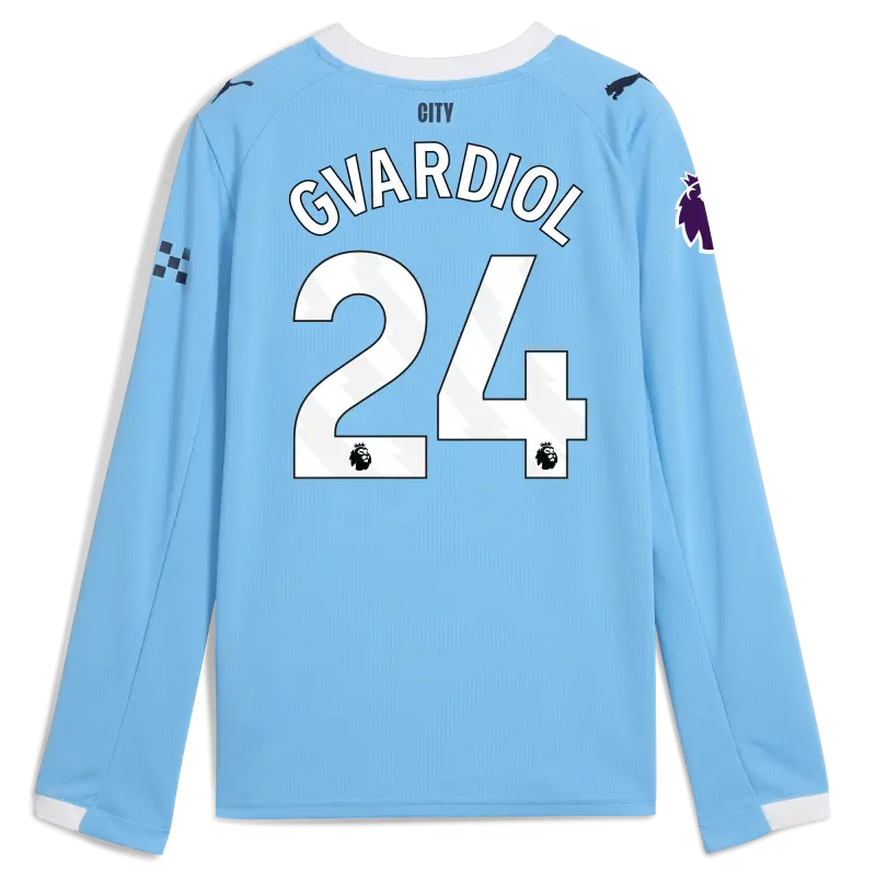 Kids’ Manchester City Premier League Home Jersey 2025/26 Long Sleeve With GVARDIOL 24 Printing
