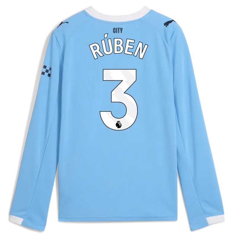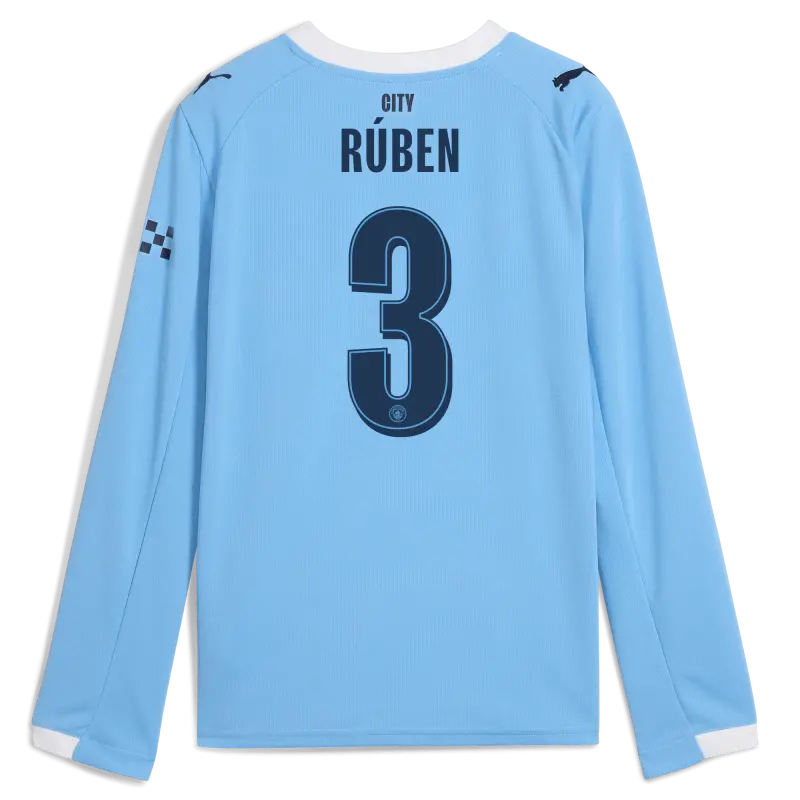 Kids’ Manchester City Man City Home Jersey 2025/26 Long Sleeve With RÚBEN 3 Printing