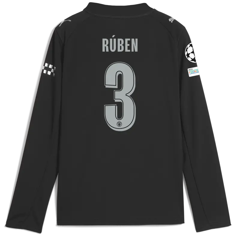 Kids’ Manchester City Man City Champions League Away Jersey 2025/26 Long Sleeve With RÚBEN 3 Printing