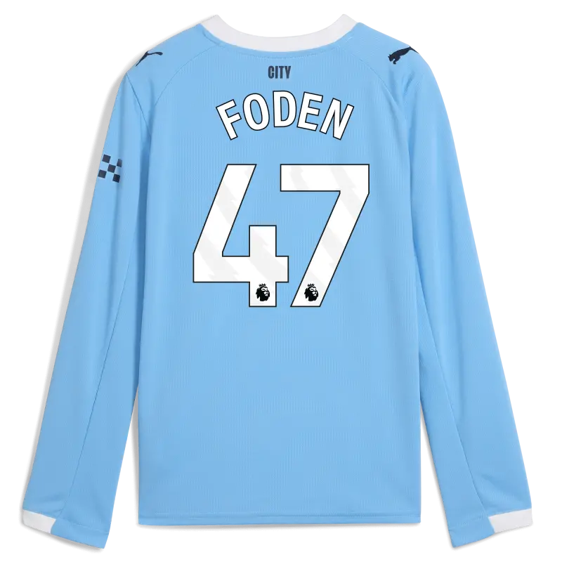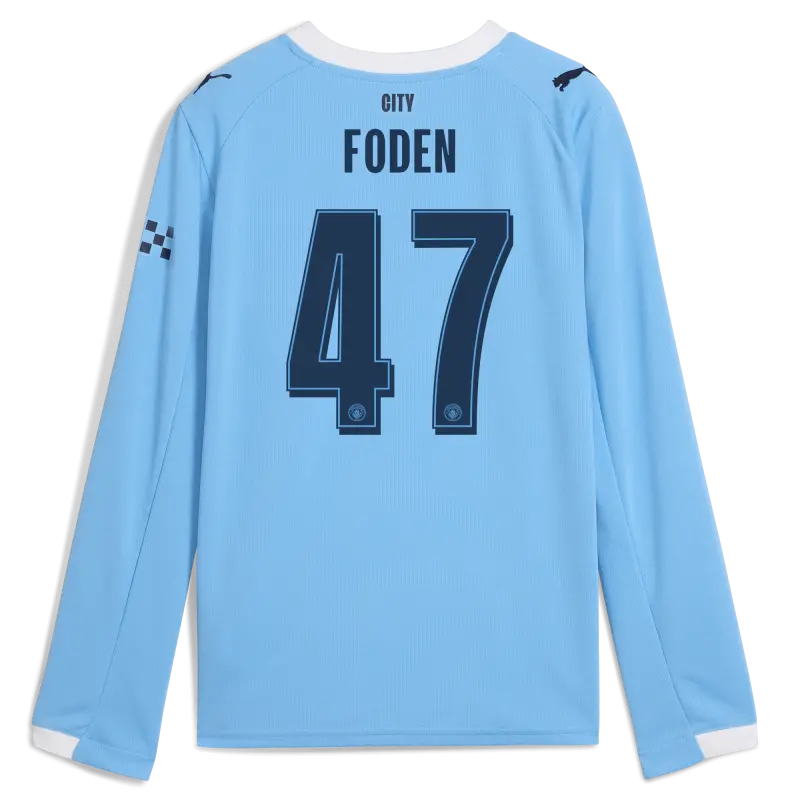 Kids’ Manchester City Home Jersey 2025/26 Long Sleeve With FODEN 47 Printing