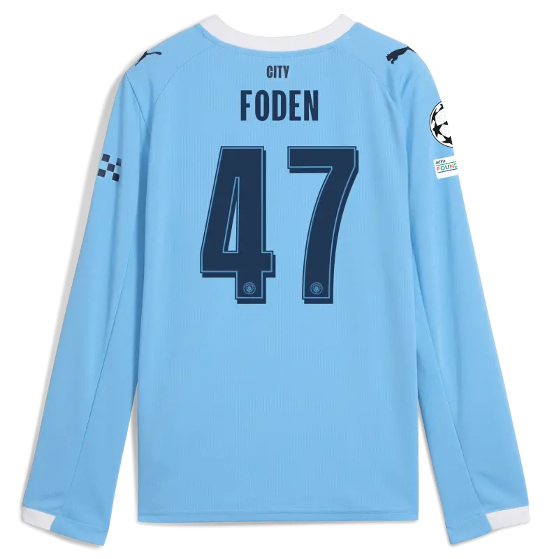 Kids’ Manchester City Man City Champions League Home Jersey 2025/26 Long Sleeve With FODEN 47 Printing