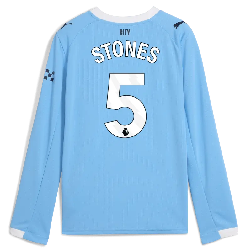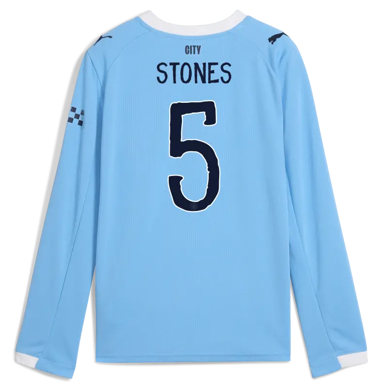 Kids’ Manchester City Man City Home Jersey 2025/26 Long Sleeve With STONES 5 Printing