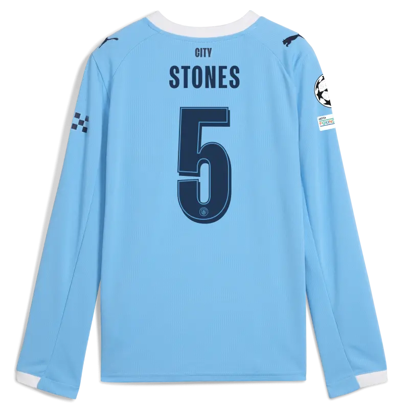 Kids’ Manchester City Man City Champions League Home Jersey 2025/26 Long Sleeve With STONES 5 Printing