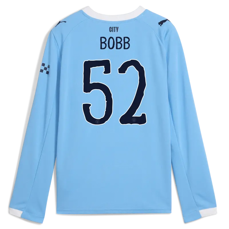 Kids’ Manchester City Home Jersey 2025/26 Long Sleeve With BOBB 52 Printing