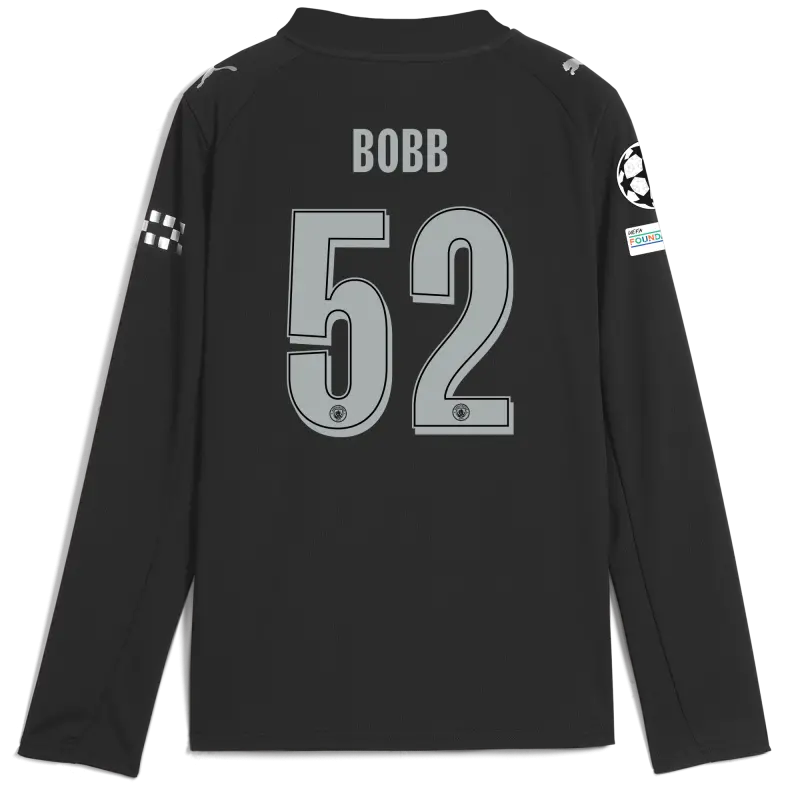 Kids’ Manchester City Man City Champions League Away Jersey 2025/26 Long Sleeve With BOBB 52 Printing