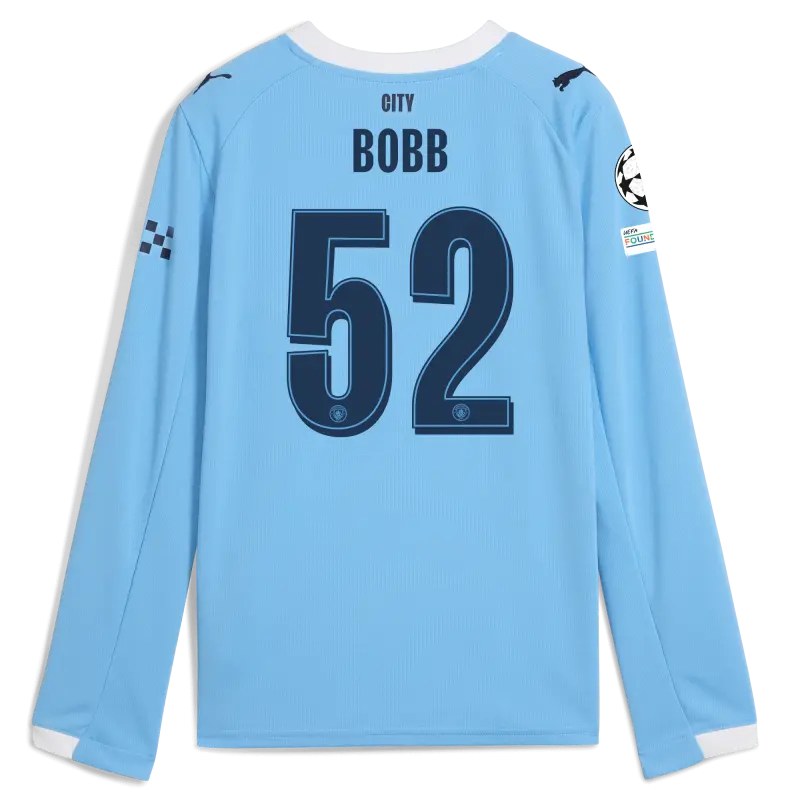 Kids’ Manchester City Man City Champions League Home Jersey 2025/26 Long Sleeve With BOBB 52 Printing