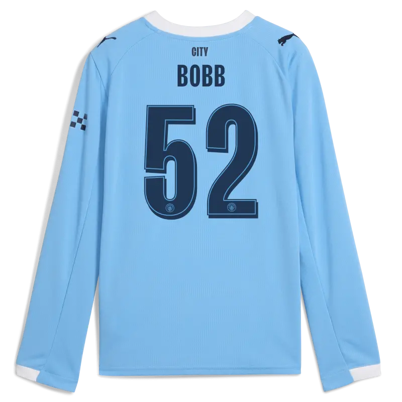 Kids’ Manchester City Man City Home Jersey 2025/26 Long Sleeve With BOBB 52 Printing