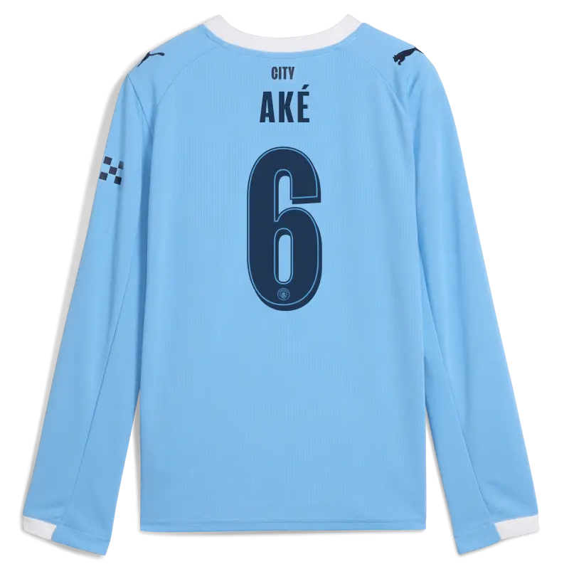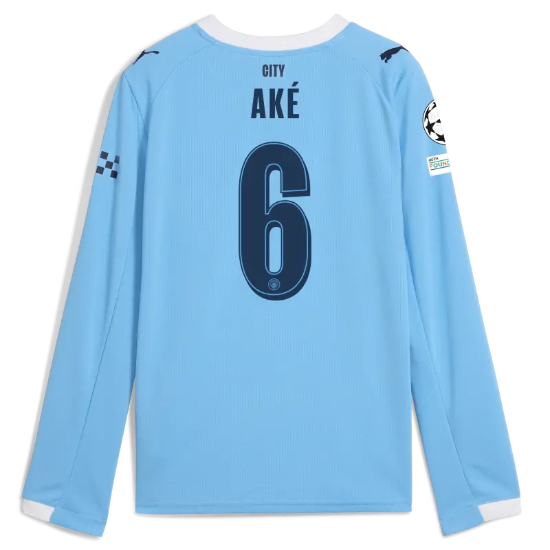Kids’ Manchester City Man City Champions League Home Jersey 2025/26 Long Sleeve With AKÉ 6 Printing