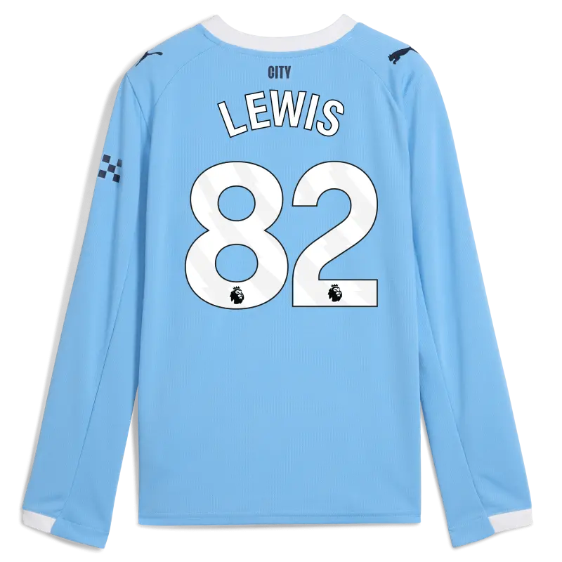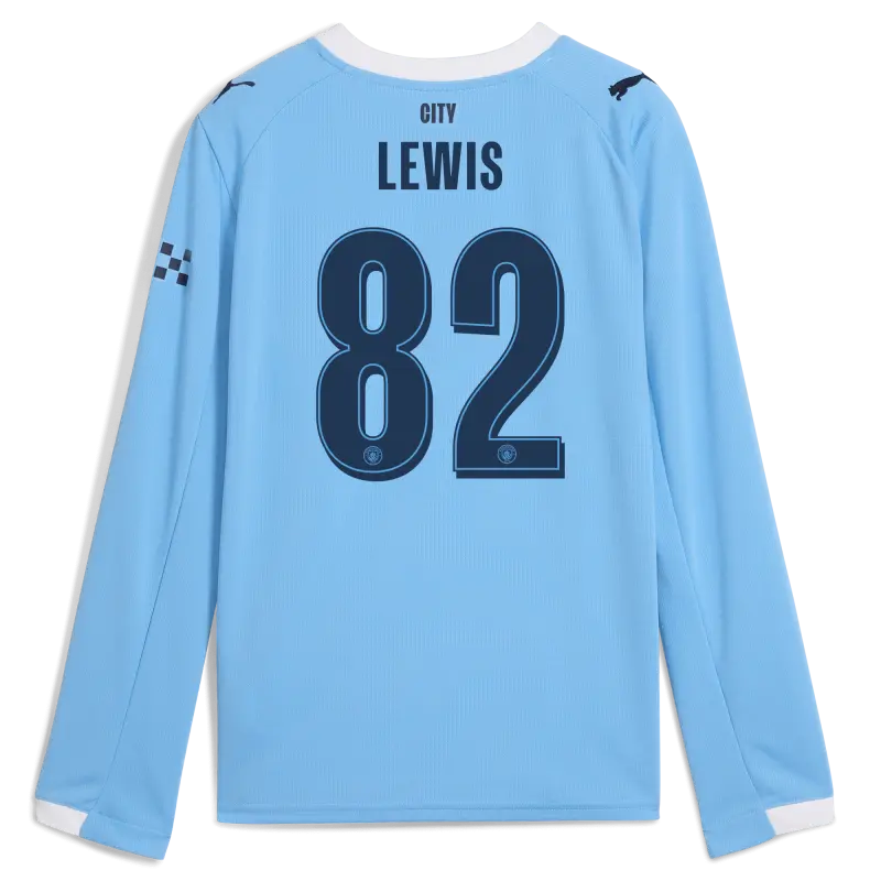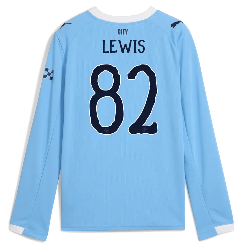 Kids’ Manchester City Man City Home Jersey 2025/26 Long Sleeve With LEWIS 82 Printing