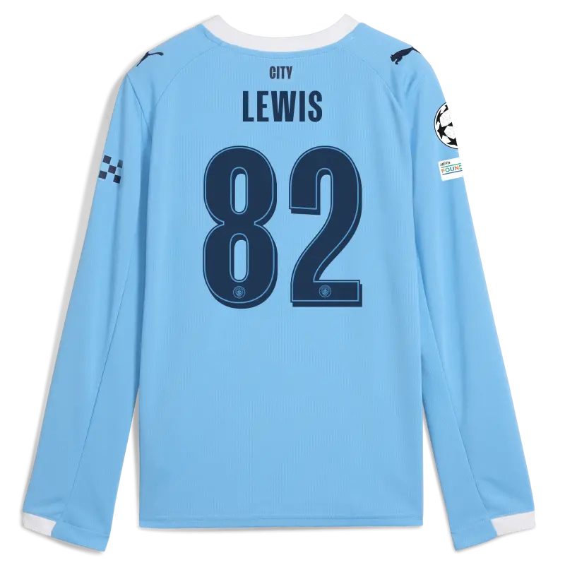 Kids’ Manchester City Man City Champions League Home Jersey 2025/26 Long Sleeve With LEWIS 82 Printing