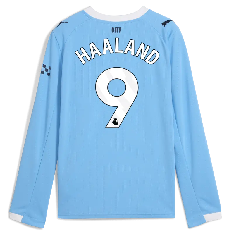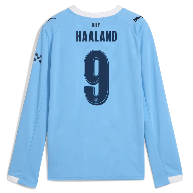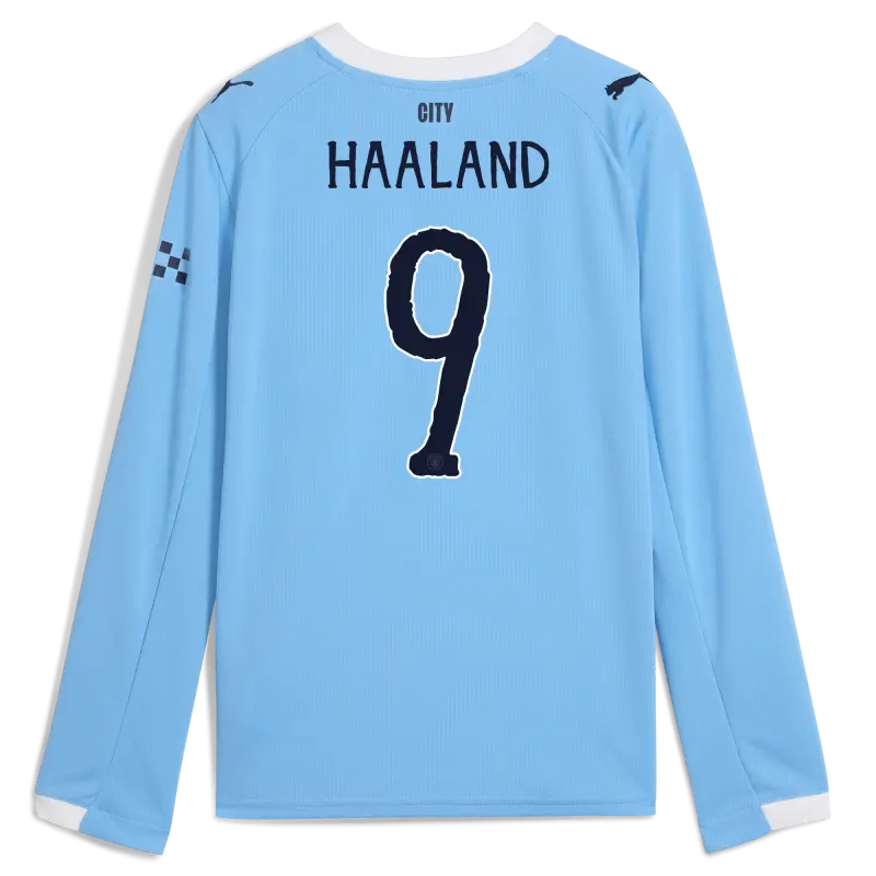 Kids’ Manchester City Man City Home Jersey 2025/26 Long Sleeve With HAALAND 9 Printing