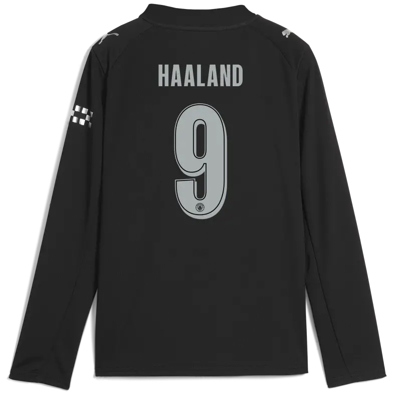 Kids’ Manchester City Man City Champions League Away Jersey 2025/26 Long Sleeve With HAALAND 9 Printing