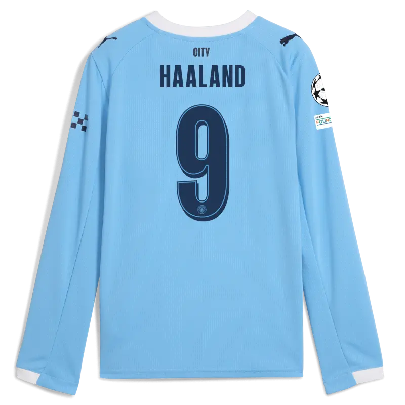 Kids’ Manchester City Man City Champions League Home Jersey 2025/26 Long Sleeve With HAALAND 9 Printing