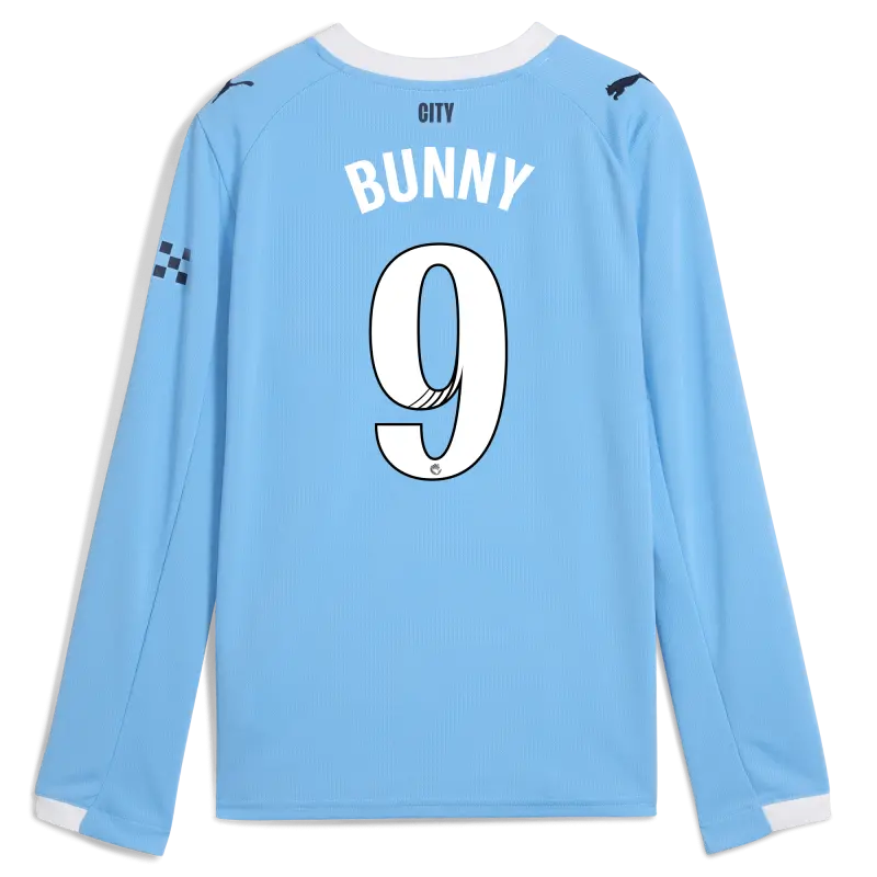 Kids’ Manchester City Home Jersey 2025/26 Long Sleeve With BUNNY 9 Printing
