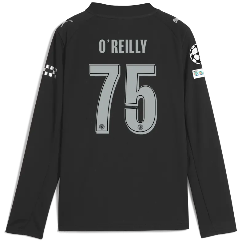 Kids’ Manchester City Man City Champions League Away Jersey 2025/26 Long Sleeve With O’REILLY 75 Printing