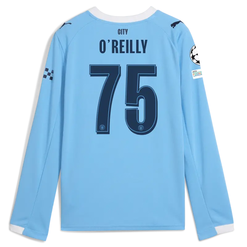 Kids’ Manchester City Man City Champions League Home Jersey 2025/26 Long Sleeve With O’REILLY 75 Printing