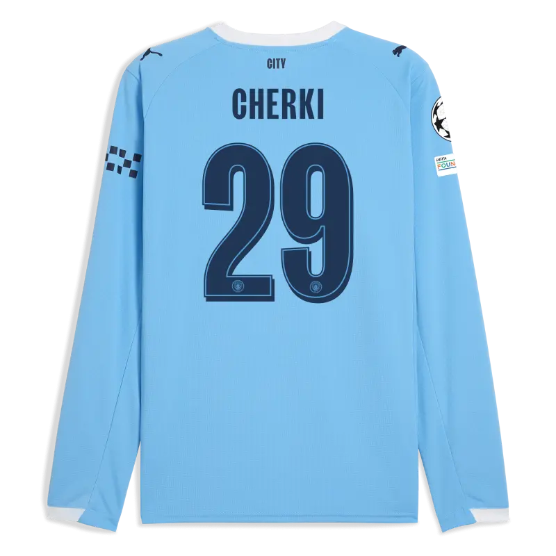 Kids’ Manchester City Man City Champions League Home Jersey 2025/26 Long Sleeve With CHERKI 29 Printing
