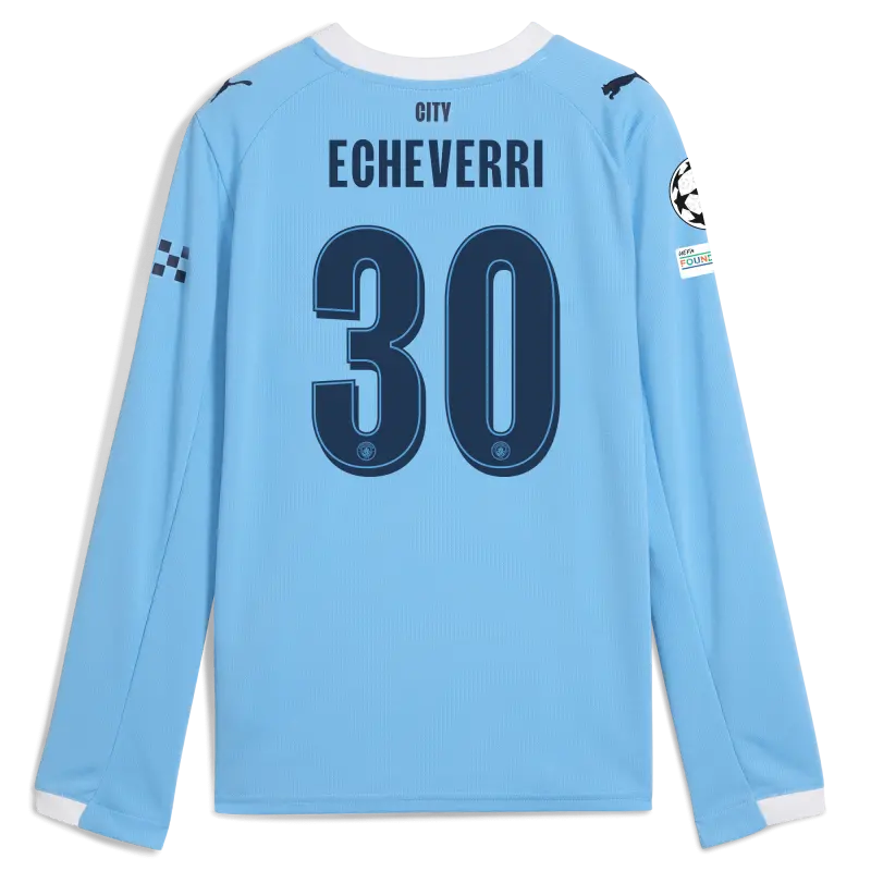 Kids’ Manchester City Man City Champions League Home Jersey 2025/26 Long Sleeve With ECHEVERRI 30 Printing
