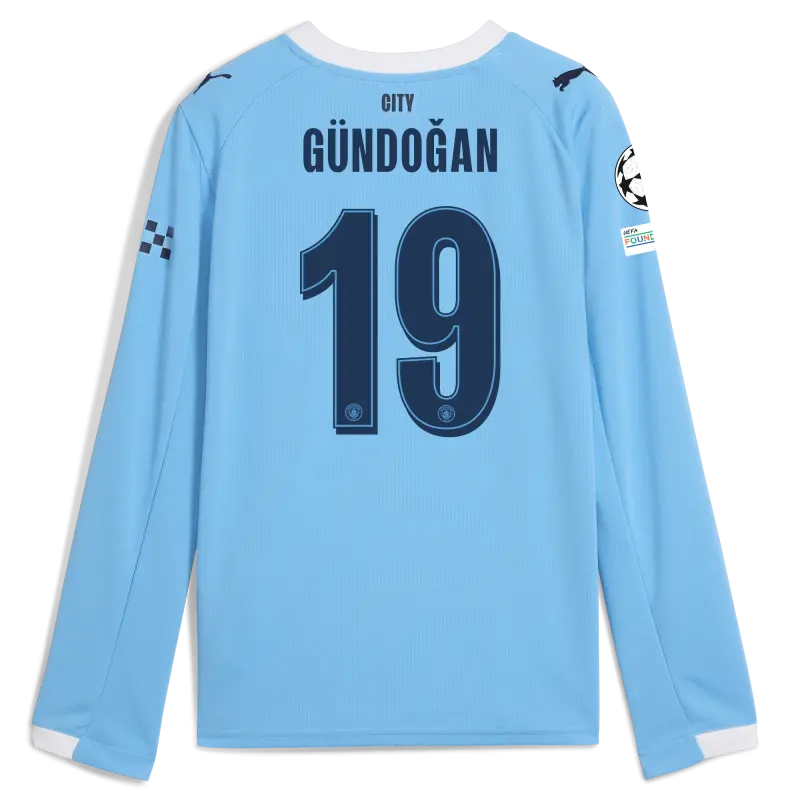 Kids’ Manchester City Man City Champions League Home Jersey 2025/26 Long Sleeve With GÜNDOĞAN 19 Printing
