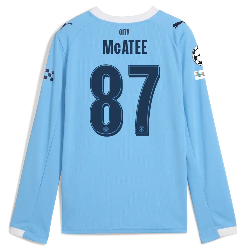 Kids’ Manchester City Man City Champions League Home Jersey 2025/26 Long Sleeve With McATEE 87 Printing