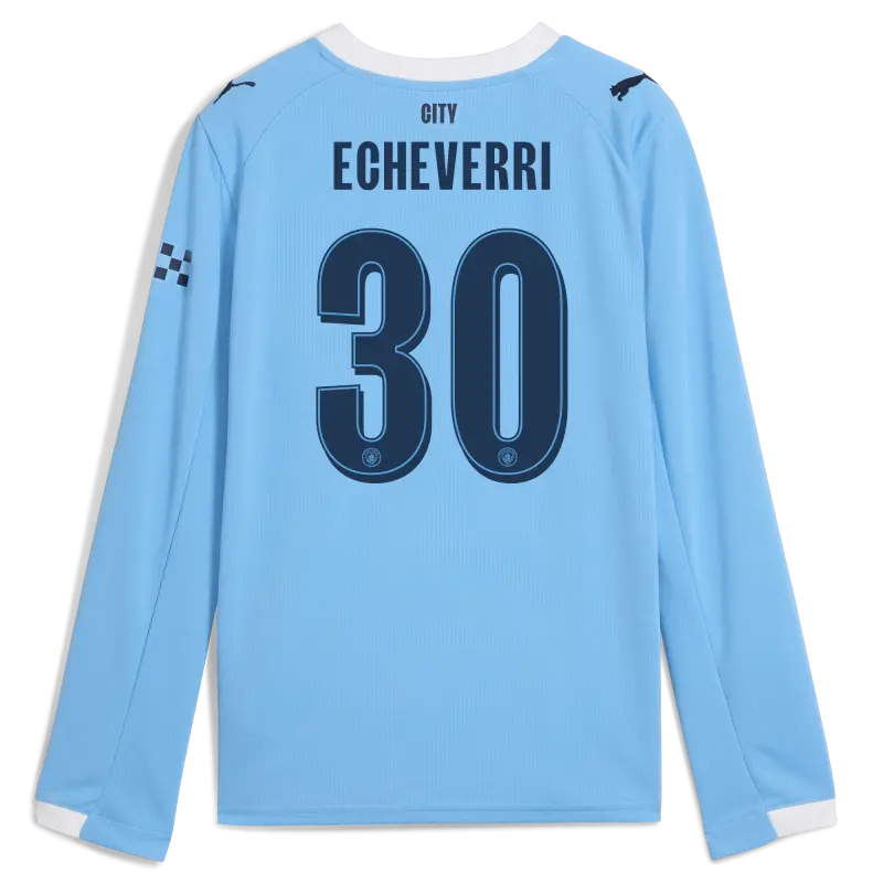 Kids’ Manchester City Man City Home Jersey 2025/26 Long Sleeve With ECHEVERRI 30 Printing