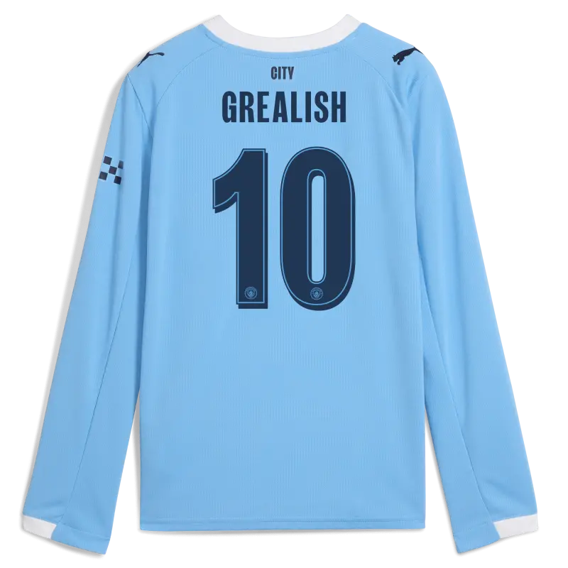 Kids’ Manchester City Man City Home Jersey 2025/26 Long Sleeve With GREALISH 10 Printing