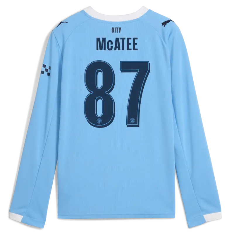 Kids’ Manchester City Man City Home Jersey 2025/26 Long Sleeve With McATEE 87 Printing