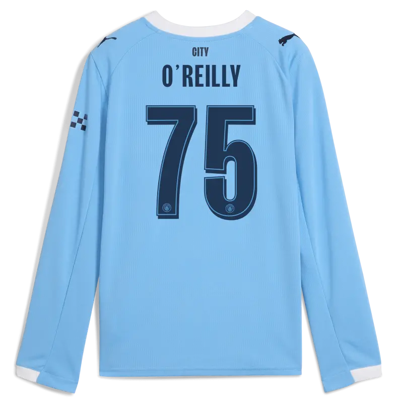 Kids’ Manchester City Man City Home Jersey 2025/26 Long Sleeve With O’REILLY 75 Printing