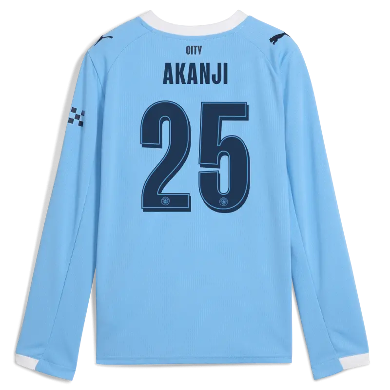 Kids’ Manchester City Man City Home Jersey 2025/26 Long Sleeve With AKANJI 25 Printing