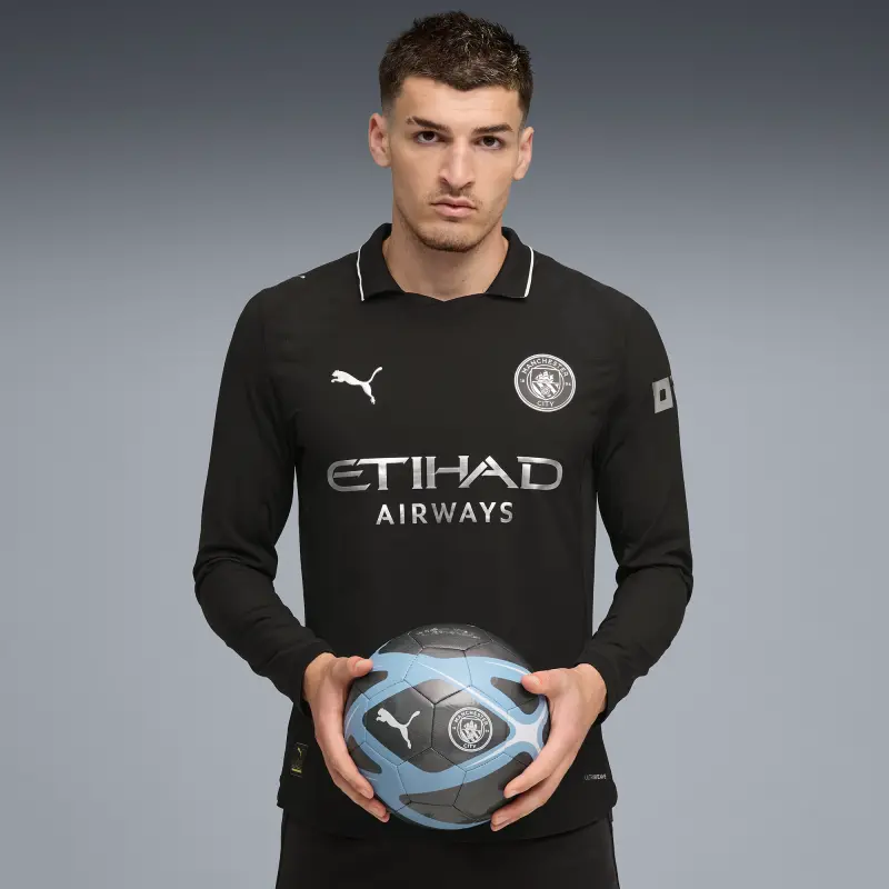 Celebrate heritage and innovation with the Manchester City Authentic Away Long Sleeve Jersey 2025/26. Inspired by Manchester City’s origins in Gorton, the 25/26 Away Kit reimagines the club’s first-known kit from 1884 with a bold all-black design and metallic detailing that brings the past into the present. A tribute to the first Cityzens, this kit marks the beginning of a new chapter—timeless, powerful and rooted in history. Built for performance, this jersey features lightweight ULTRAWEAVE fabric and dryCELL sweat-wicking technology to keep you cool and comfortable. Mesh panels on the shoulders, sides, and underarms enhance breathability, while laser-cut detailing on the chest adds a premium finish. Finished with the Manchester City crest, PUMA Cat logos, and an Authentic Licensed Product label featuring a heat-transfer 3D weld mirage effect, this long-sleeved jersey is a must-have for all dedicated Cityzens.