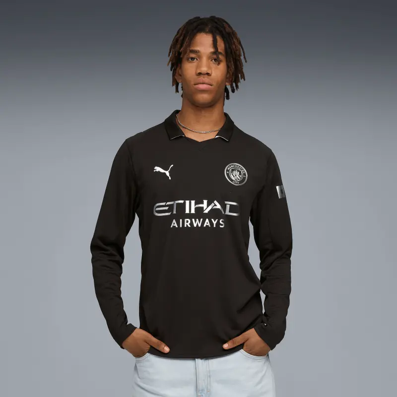 The Manchester City Away Long Sleeve Jersey 2025/26 beautifully blends the club’s rich heritage with modern performance. Inspired by Manchester City’s origins in Gorton, the 25/26 Away Kit reimagines the club’s first-known kit from 1884 with a bold all-black design and metallic detailing that brings the past into the present. This jersey is a tribute to the first Cityzens. Built for comfort and performance, it features dryCELL sweat-wicking technology and breathable mesh panels on the shoulders, sides, and underarms to keep you cool and dry. The regular fit and long sleeves provide all-day comfort, while the official Manchester City crest and PUMA Cat logos complete the look. Timeless, minimalist and powerful, this is the new Manchester City Away Jersey.