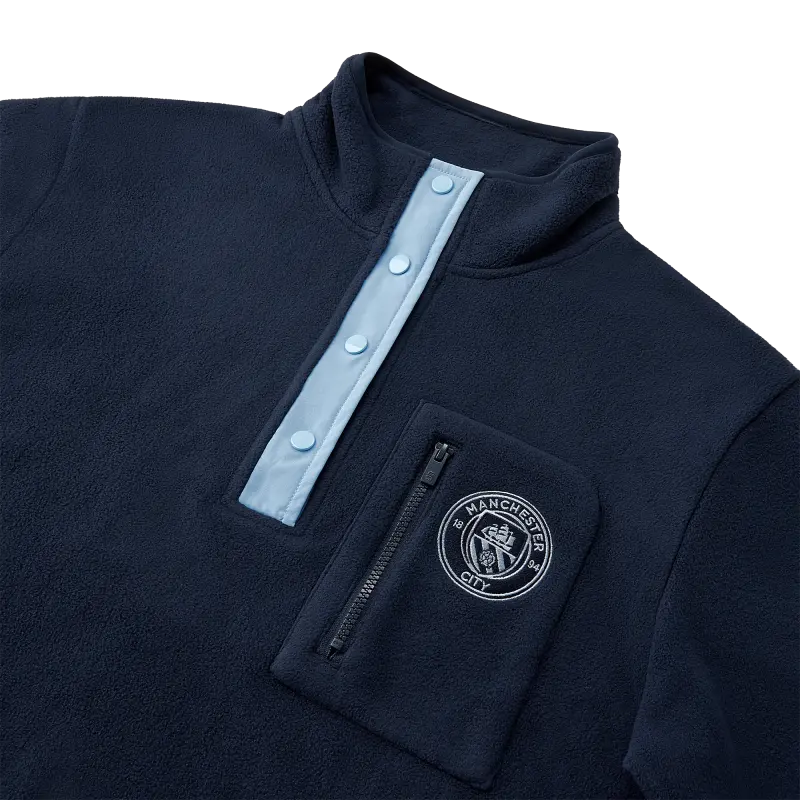 The Manchester City Quarter Zip Fleece offers cosy 300gsm polyester microfleece warmth with an embroidered crest, chest pocket, and hand pockets—ideal for layering in comfort while proudly displaying your City spirit.