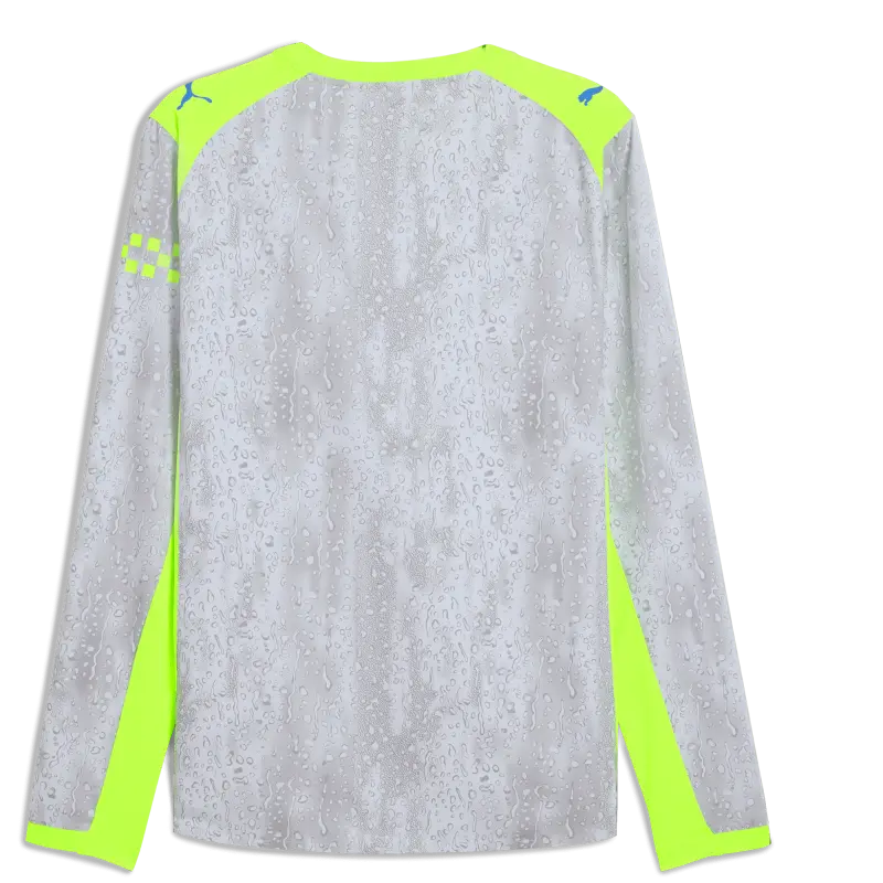 Defy the elements in the Manchester City Authentic Third Long Sleeve Jersey 2025/26. Crafted with cutting-edge ULTRAWEAVE fabric, this jersey is ultra-light to reduce friction and enhance mobility. dryCELL technology keeps you cool and dry, even when the pressure rises. Featuring long sleeves, a regular fit, and mesh panels at the shoulders, sides, and underarms, it’s built for breathability and performance. The club crest and PUMA Cat logos bring the team spirit, while the heat-transferred Authentic Licensed Product label adds a premium touch. Finished with a bold rain design and a “Rain or Shine” print on the inner side of the collar. Man City are a symbol of the people, the culture, and the humour of Manchester. That’s why the 25/26 Third Kit is a tribute to Mancunian weather, designed for those who carry City in their hearts, rain or shine (Though, let’s be honest, mostly rain).