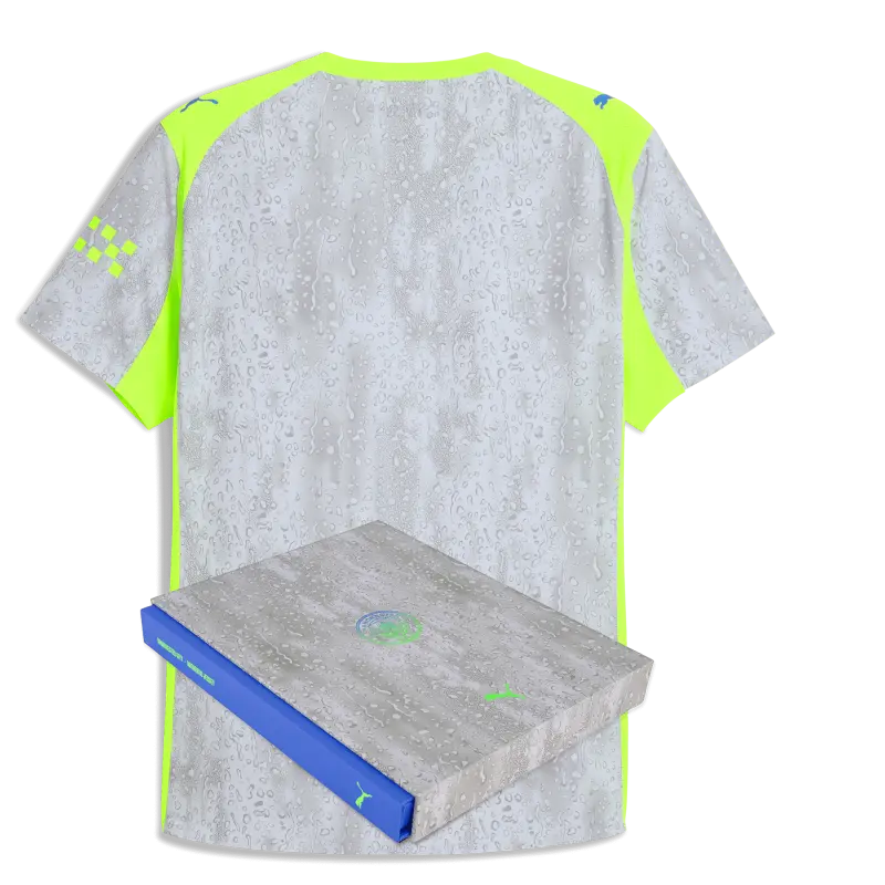 Defy the elements in the Manchester City Authentic Third Jersey 2025/26. Crafted with cutting-edge ULTRAWEAVE fabric, this jersey is ultra-light to reduce friction and enhance mobility. dryCELL technology keeps you cool and dry, even when the pressure rises. Featuring short sleeves, a slim fit, and mesh panels at the shoulders, sides, and underarms, it’s built for breathability and performance. The club crest and PUMA Cat logos bring the team spirit, while the heat-transferred Authentic Licensed Product label adds a premium touch. Finished with a unique rain design and a “Rain or Shine” print on the inner side of the collar. Man City are a symbol of the people, the culture, and the humour of Manchester. That’s why the 25/26 Third Kit is a tribute to Mancunian weather, designed for those who carry City in their hearts, rain or shine (Though, let’s be honest, mostly rain). Comes in a gift box, beautifully wrapped in tissue paper to make the unboxing moment special.