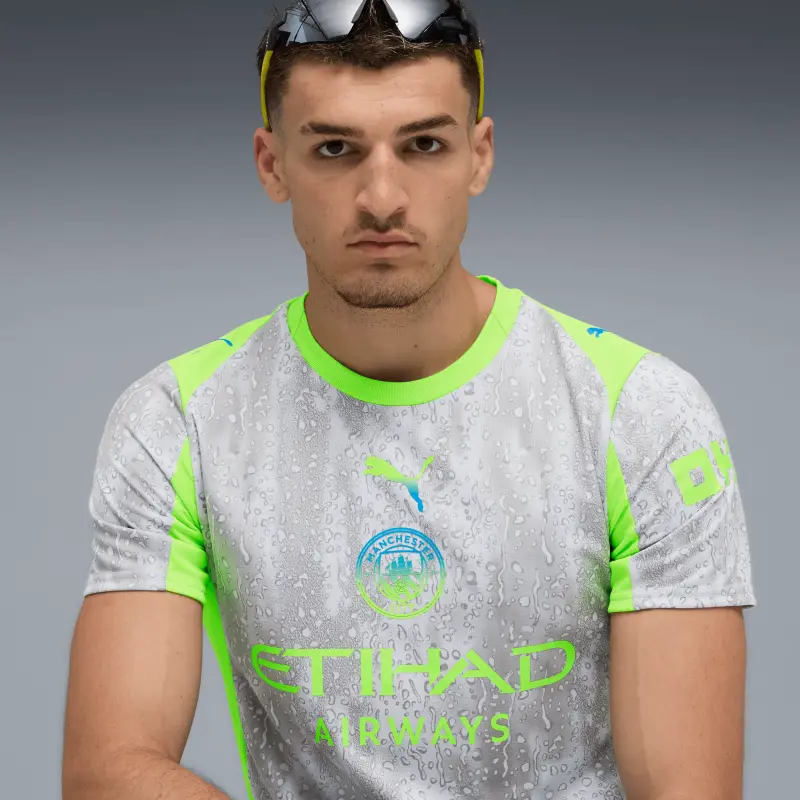 • Rain is part of our identity, but it never dims our shine. Defy the elements and stand out in the MCFC Third Kit.